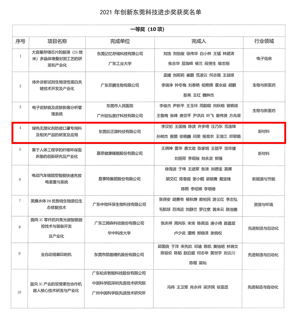 近日,2021年創(chuàng)新東莞科學技術(shù)獎獲獎項目名單發(fā)布。東莞巨正源科技有限公司研發(fā)的“綠色無塑化劑防疫口罩專用料及相關(guān)產(chǎn)品的研發(fā)及應用”項目榮獲東莞市科技進步獎一等獎。