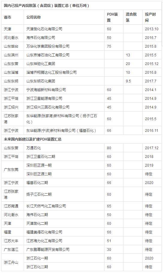 近年來,丙烷脫氫工藝在中國迅速發(fā)展,產(chǎn)能擴張速度驚人,逐漸成為丙烯重要來源之一。自2013年10月,隨著天津渤化60萬噸/年的丙烷脫氫裝置投產(chǎn)運行,丙烷脫氫裝置在國內(nèi)正式拉開序幕。此后的幾年里,丙烷脫氫裝置在國內(nèi)遍地開花,迅速發(fā)展,主要集中在華東的江浙地區(qū)、華北地區(qū)以及山東地區(qū),而且近兩三年混合烷烴脫氫這種更加靈活的裝置在山東地區(qū)陸續(xù)投產(chǎn)運行。至今,國內(nèi)丙烷脫氫(含混烷)制丙烯總產(chǎn)能達到513.5萬噸。但是從下表可以看出,華南地區(qū)尚無丙烷脫氫裝置,深圳巨正源丙烷脫氫裝置建成后,將填補華南地區(qū)丙烷脫氫制高性能聚丙烯及下游加工項目的空缺,給當?shù)鼗て髽I(yè)提供優(yōu)質(zhì)的化工原料。