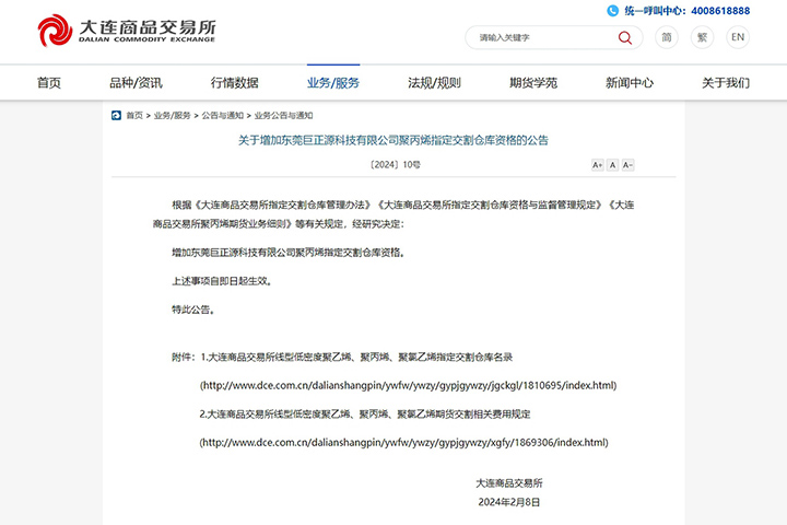 2月8日,大連商品交易所官網(wǎng)發(fā)布公告,增加東莞巨正源科技有限公司為聚丙烯期貨交割業(yè)務“指定廠庫”。這是繼“巨正源”牌聚丙烯成為期貨注冊品牌、免檢品牌后取得的又一重要成果。