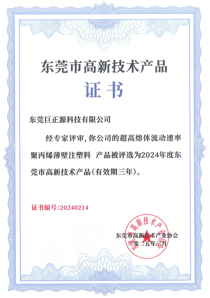 日前,東莞市高新技術(shù)產(chǎn)業(yè)協(xié)會公布了2024年東莞市高新技術(shù)產(chǎn)品名單。東莞巨正源科技有限公司自主研發(fā)、生產(chǎn)的超高熔體流動速率聚丙烯薄壁注塑料產(chǎn)品成功入選,被評選為2024年度東莞市高新技術(shù)產(chǎn)品,有效期三年。