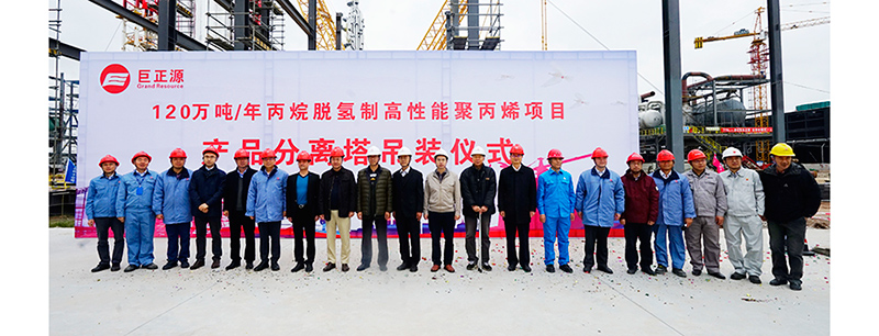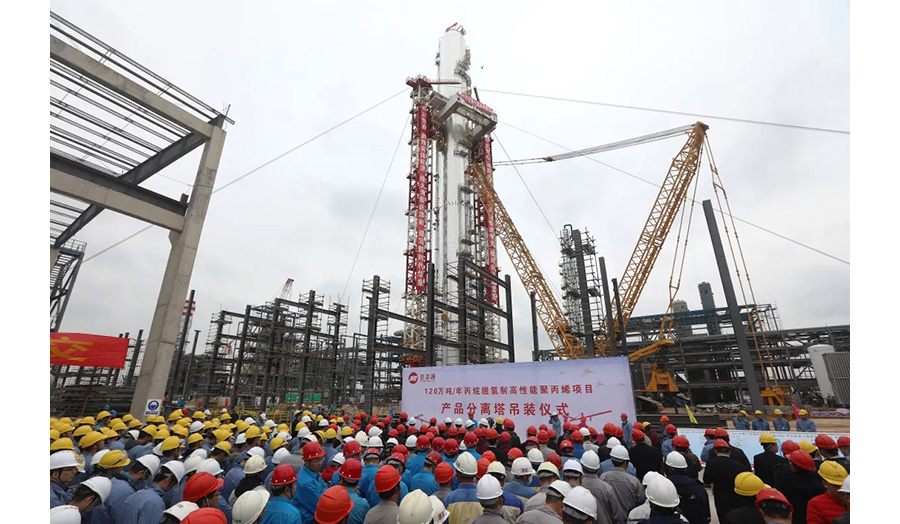 12月12日上午,巨正源公司120萬噸/年丙烷脫氫制高性能聚丙烯項目(以下簡稱“丙烷脫氫項目”)產品分離塔吊裝儀式在東莞市沙田鎮(zhèn)立沙島舉行。最大直徑12米、高128米,總重量約3050噸的“巨無霸”——產品分離塔整體一次成功吊裝就位,創(chuàng)造了國內乃至亞洲大型設備吊裝新紀錄,同時也標志著丙烷脫氫項目第一階段工程建設全面進入沖刺階段。
