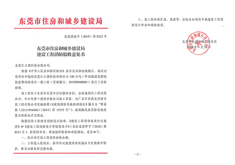 對工程建設而言,消防驗收是竣工使用前的最后一道程序,針對性強、綜合性復雜。特別是近期的行政審批改革后,消防驗收劃入東莞市住房和建設局的職能,驗收環(huán)節(jié)更為苛刻。為確保聚丙烯項目一期工程順利通過消防驗收,巨正源科技公司高度重視、精心組織,調集各專業(yè)室對廠區(qū)存在的消防安全隱患進行自查自糾,嚴把質量關、安全關,切實解決各種疑難雜癥,全力推動消防驗收工作。經資料審查、現場抽樣檢查和功能測試,驗收組對聚丙烯項目一期工程給予充分肯定,一致同意通過此次驗收,并出具消防驗收意見書。
