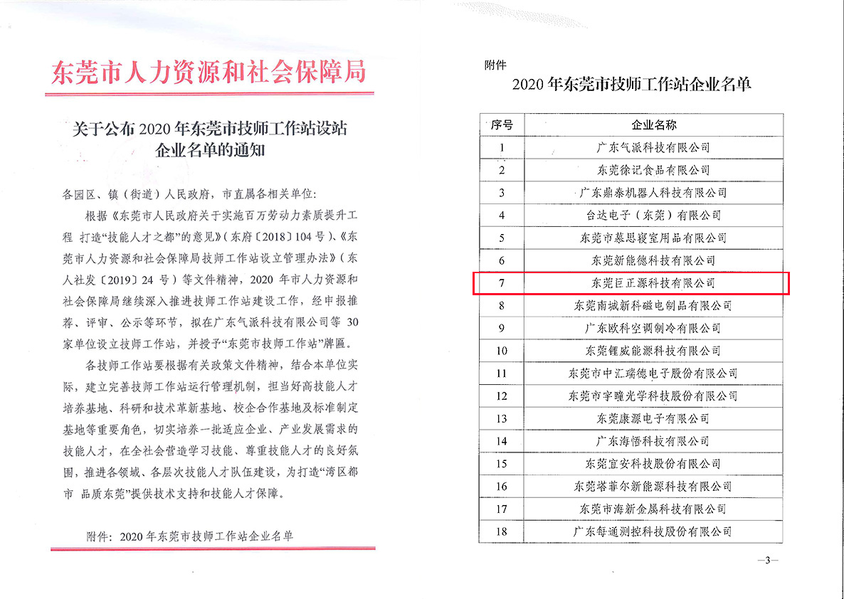 11月9日,東莞市人力資源和社會保障局公布2020年東莞市技師工作站設站企業(yè)名單。經(jīng)過申報推薦、專家評審、資格審查、社會公示,東莞巨正源科技有限公司成功獲批設立“東莞市技師工作站”。