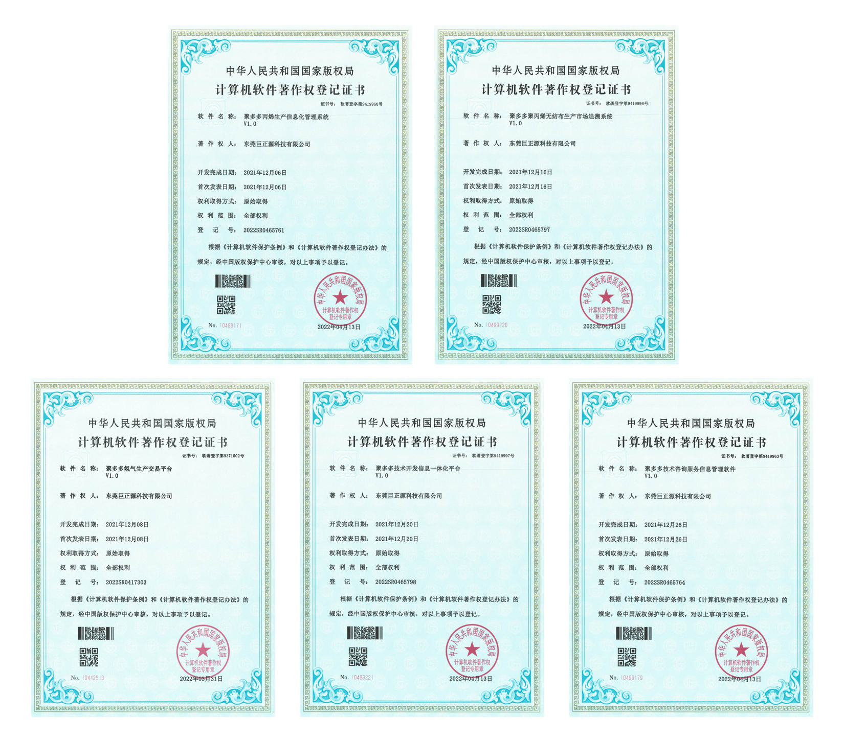 此次獲得軟件著作權(quán)證書包括:《聚多多氫氣生產(chǎn)交易平臺V1.0》、《聚多多丙烯生產(chǎn)信息化管理系統(tǒng)V1.0》、《聚多多技術(shù)咨詢服務(wù)信息管理軟件V1.0》、《聚多多聚丙烯無紡布生產(chǎn)市場追溯系統(tǒng)V1.0》、《聚多多技術(shù)開發(fā)信息一體化平臺V1.0》。這些都是巨正源公司圍繞以“技術(shù)創(chuàng)新”和“產(chǎn)品研發(fā)”通過自主研發(fā)推進(jìn)自動化生產(chǎn)、智能化管理所取得的知識產(chǎn)權(quán)成果,并全部應(yīng)用于公司生產(chǎn)信息系統(tǒng)中,為聚多多電商平臺技術(shù)開發(fā)、服務(wù)管理、實現(xiàn)創(chuàng)新平臺線上銷售模式提供信息化數(shù)字基礎(chǔ)。