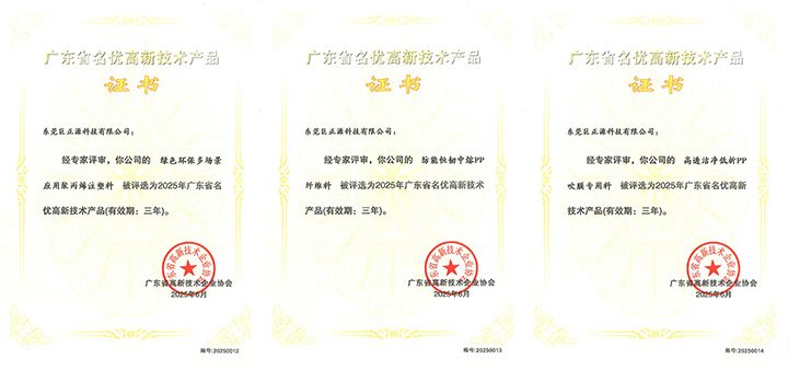 近日,廣東省高新技術(shù)企業(yè)協(xié)會公布了2025年第一批廣東省名優(yōu)高新技術(shù)產(chǎn)品名單。東莞巨正源科技有限公司的“綠色環(huán)保多場景應(yīng)用聚丙烯注塑料”、“紡能恒韌中熔PP纖維料”、“高透潔凈低析PP吹膜專用料”三項產(chǎn)品憑借卓越的產(chǎn)品品質(zhì)、創(chuàng)新的產(chǎn)品技術(shù)和領(lǐng)先的市場地位,榮獲“廣東省名優(yōu)高新技術(shù)產(chǎn)品”稱號。