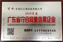 近日,經(jīng)東莞市市場(chǎng)監(jiān)督管理局審核批準(zhǔn),東莞巨正源科技有限公司獲得2019年度“廣東省守合同重信用企業(yè)”榮譽(yù)稱號(hào)。