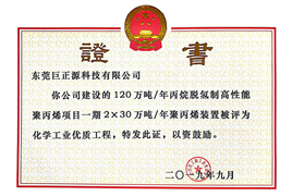 近日,中國化工施工企業(yè)協(xié)會公布全面提升工程質(zhì)量創(chuàng)建優(yōu)質(zhì)精品工程活動(dòng)成果。巨正源公司投資建設(shè)的“120萬噸/年丙烷脫氫制高性能聚丙烯項(xiàng)目”一期2×30萬噸/年聚丙烯裝置獲評全國“化學(xué)工業(yè)優(yōu)質(zhì)工程”。