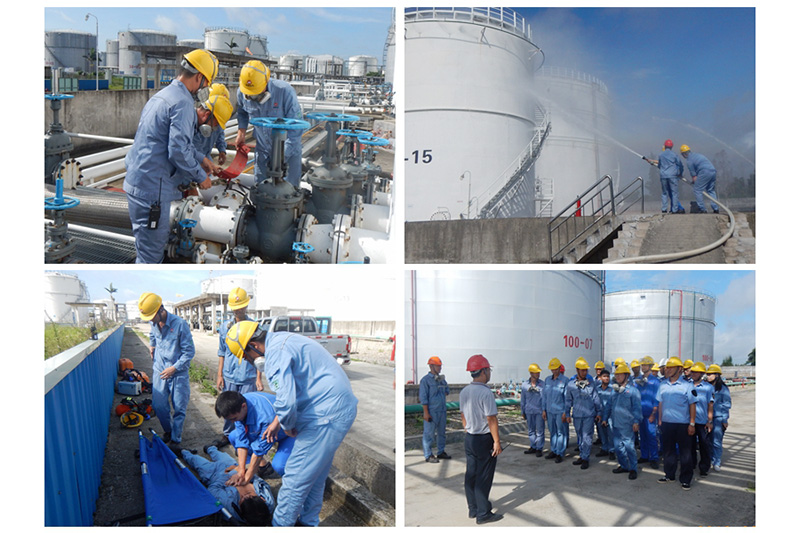 上午9:00,15號罐進出油短管發(fā)生泄漏,警報鈴響起,演練開始。救援隊伍向事故點緊急集結、各應急小組迅速開展救援工作。演練模擬堵漏過程中,由于金屬意外碰撞產(chǎn)生火花,現(xiàn)場發(fā)生火災。搶險救災組、物資供應組使用水槍、泡沫槍撲救初起火災。在向公司領導報告后,通信聯(lián)絡人員按指示向茂港消防大隊請求救援。9:30,火勢失控,引起油罐爆炸,救援人員緊急撤退。在消防大隊抵達現(xiàn)場后,應急小組協(xié)助消防員開展滅火救災工作。經(jīng)過緊張的應急處置,火災在9:42分最終被撲滅。