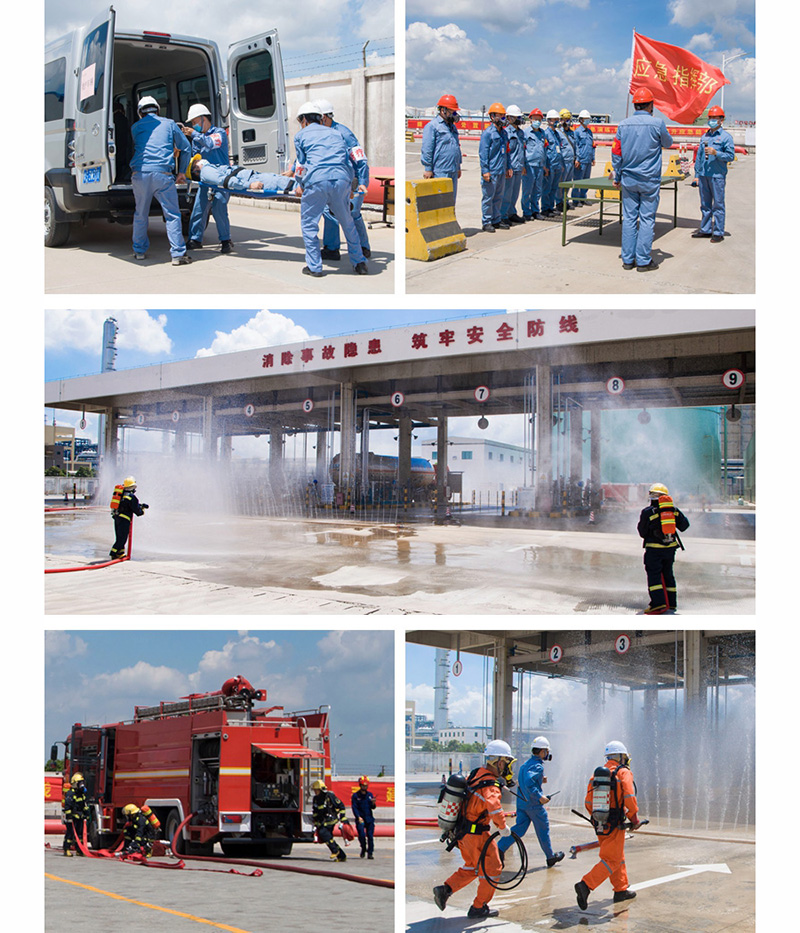 上午10:00,沙田鎮(zhèn)委副書記袁樹堅宣布演練正式開始。此次演練現(xiàn)場模擬移動式壓力容器在裝卸臺進行丙烷充裝時發(fā)生大量泄漏,一名充裝員工凍傷,因泄漏量大無法靠近,其他員工立即將受傷員工轉移至安全區(qū)域,并先后啟動裝置級、公司級事故應急救援預案,公司領導接報后立即趕往事故現(xiàn)場,成立現(xiàn)場指揮部,生產(chǎn)處置組、疏散組、警戒組、救援組、消防組、后勤組、工程搶險組等按照各自的應急處置職責迅速開展救援工作。